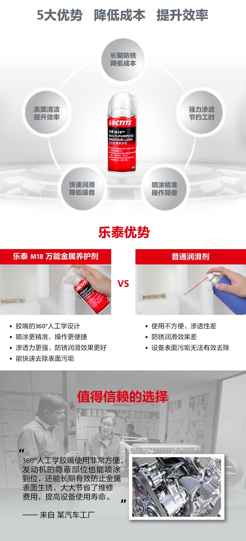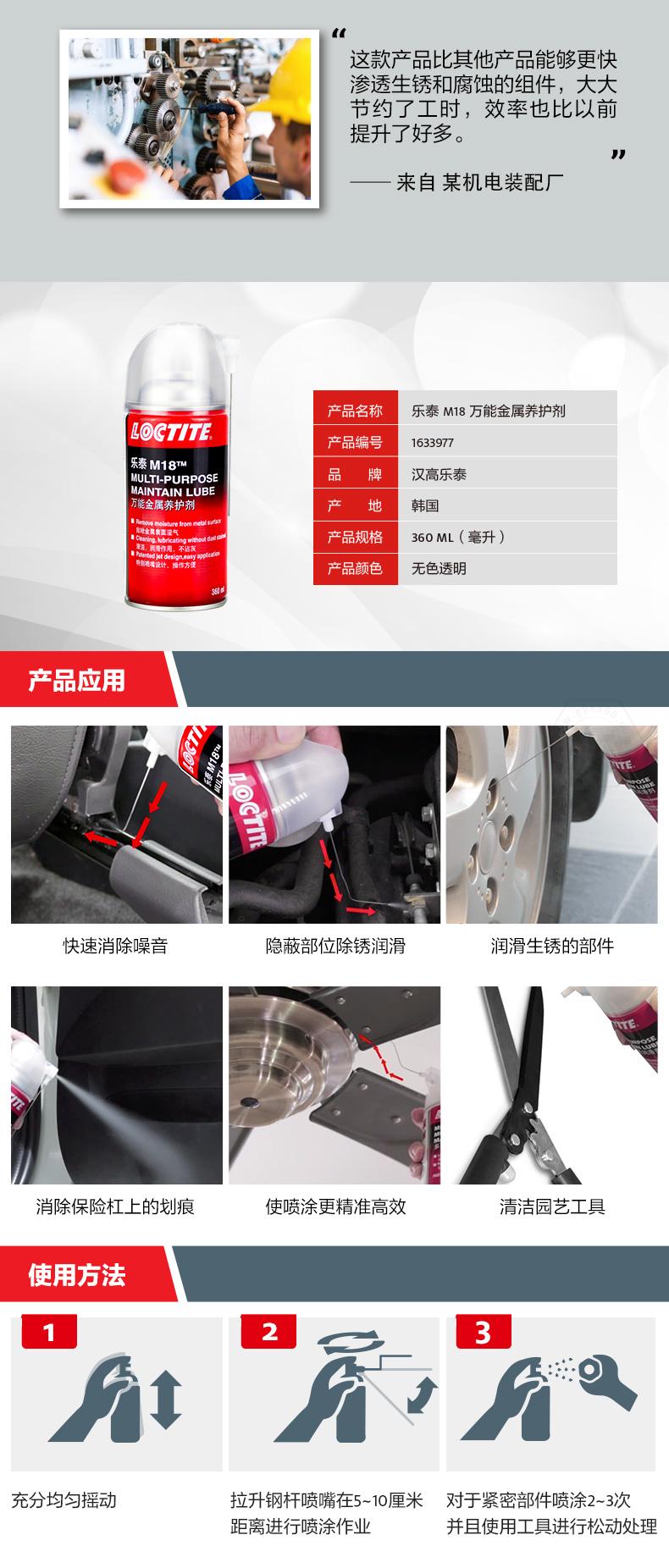 樂泰M18萬能金屬養(yǎng)護(hù)劑是一款集防銹、滲透、潤滑、清潔于一體的產(chǎn)品。樂泰M18萬能金屬養(yǎng)護(hù)劑由于低表面張力,能夠在水分和金屬表面之間形成保護(hù)屏障,實現(xiàn)長期防銹。樂泰M18萬能金屬養(yǎng)護(hù)劑可快速滲透生銹和腐蝕組件,節(jié)約工時。樂泰M18萬能金屬養(yǎng)護(hù)劑采用360°人工學(xué)膠嘴,噴涂更精準(zhǔn),操作更簡便,還可快速潤滑并降低噪音,同時去除表面較輕微污垢,提升效率。