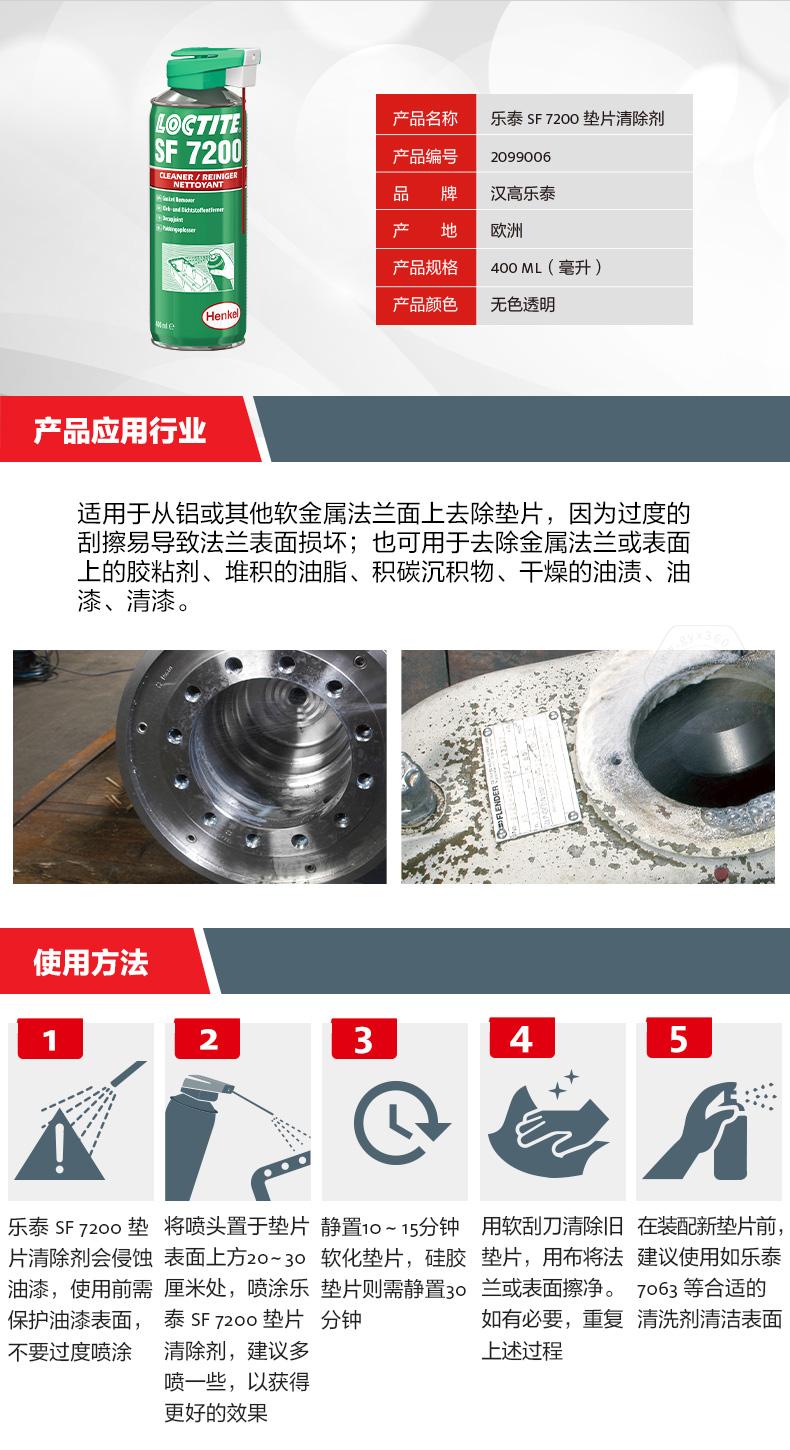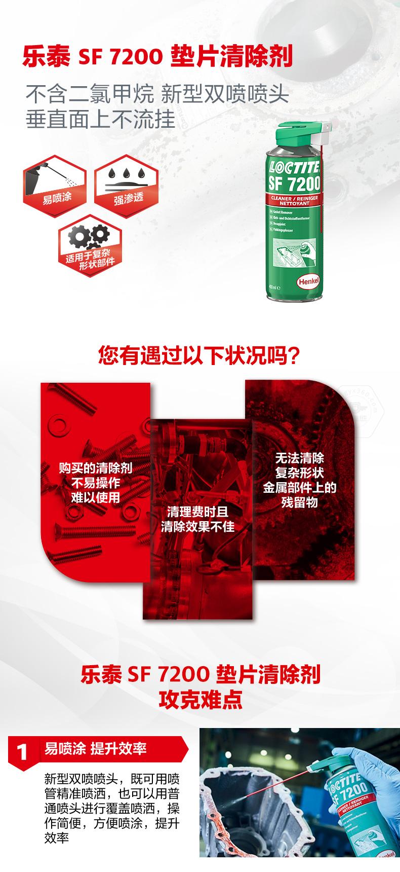 樂(lè)泰SF7200墊片清除劑主打易噴涂、強(qiáng)滲透和適用于復(fù)雜形狀部件。樂(lè)泰SF7200墊片清除劑采用新型雙噴噴頭,既可用噴管精準(zhǔn)噴灑,也可用普通噴頭覆蓋噴灑,垂直面上不流掛,操作更方便。樂(lè)泰SF7200墊片清除劑不含二氯甲烷,可快速去除污垢,節(jié)約工時(shí),降低成本。樂(lè)泰SF7200墊片清除劑適用于從鋁或其他軟金屬法蘭面上去除墊片,也可用于清除膠粘劑、油脂、積碳、干燥油漆和清漆殘留。