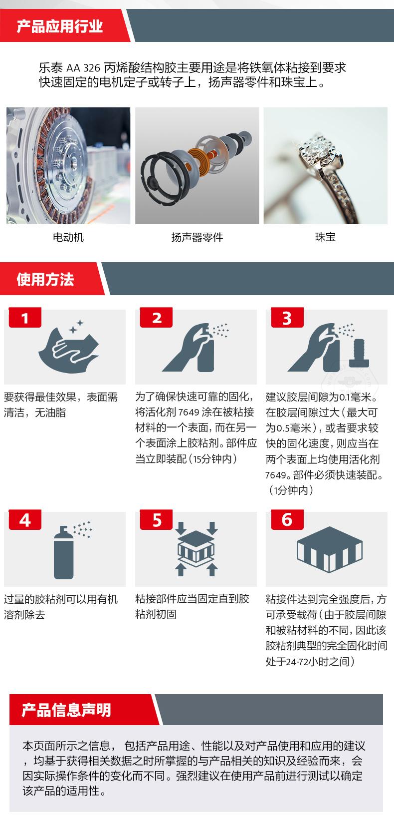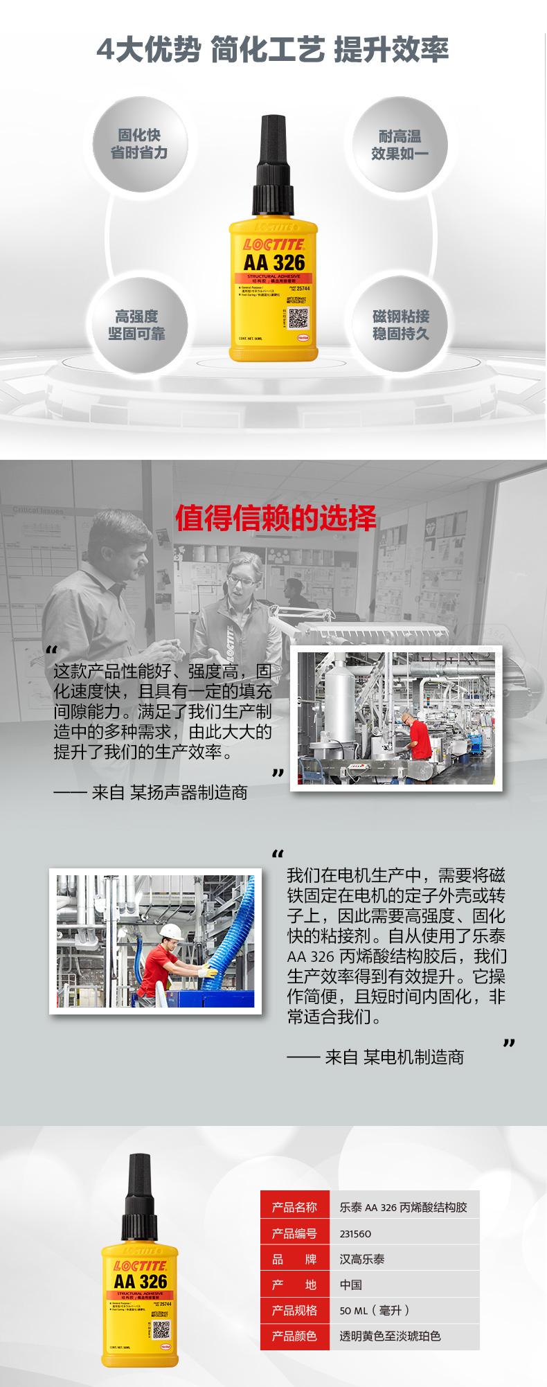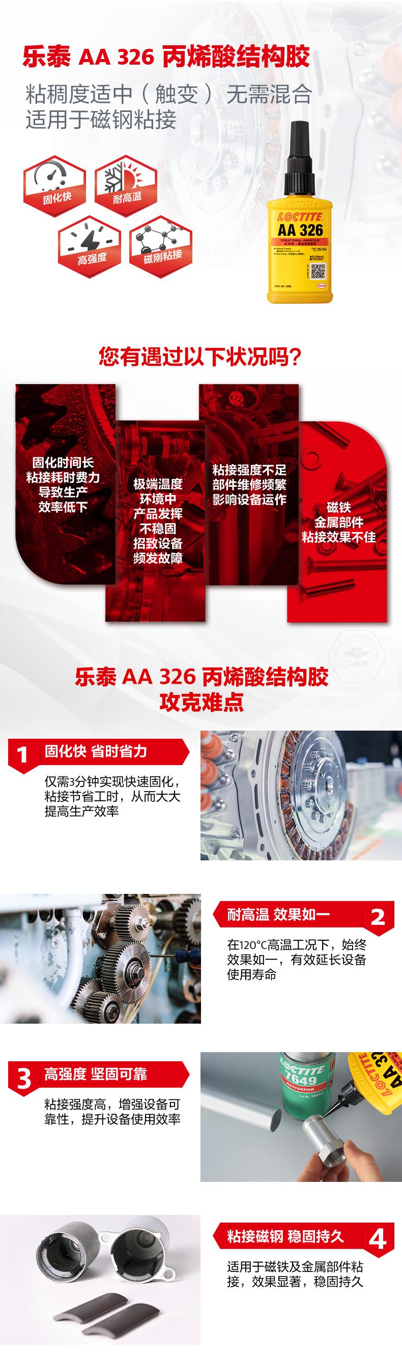 樂泰AA326丙烯酸結(jié)構(gòu)膠粘稠度適中(觸變),無需混合,適用于磁鋼及金屬部件粘接。樂泰AA326丙烯酸結(jié)構(gòu)膠僅需3分鐘即可快速固化,節(jié)省工時(shí)。樂泰AA326丙烯酸結(jié)構(gòu)膠在120℃高溫工況下效果如一,且具備高強(qiáng)度特點(diǎn)。樂泰AA326丙烯酸結(jié)構(gòu)膠主要用于將鐵氧體粘接到要求快速固定的電機(jī)定子或轉(zhuǎn)子上,也可用于揚(yáng)聲器零件和珠寶。